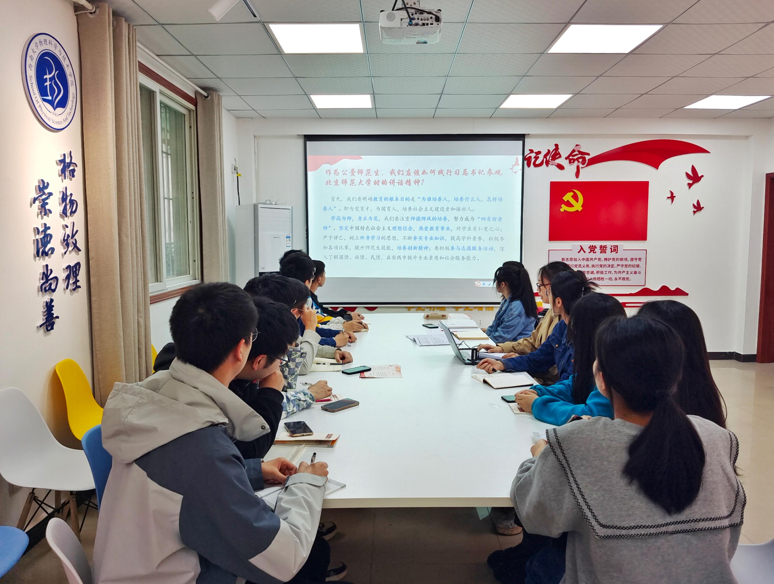 集中学习结束后,与会党员同志们重点围绕“作为公费师范生,应该如何践行习近平总书记同北京师范大学师生代表座谈时的重要讲话精神,争做新时代‘接班人’”这一主题进行了深入讨论。大家一致认为,在今后的学习生活中,要牢记习近平总书记的殷殷嘱托,身体力行、带头践行社会主义核心价值观,努力做到“四有”,自觉抵御各种外部的干扰和诱惑,敢于同各种不良现象做斗争,练就过硬教书育人本领,真正成为造就未来实现中华民族伟大复兴“梦之队”的“筑梦人”,成为党和人民满意的好老师。