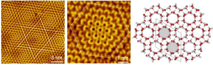 王俊忠教授课题组利用低温生长和后期退火方法制备出二维冰膜,并发现水分子在石墨衬底上能够形成一种新的高密度冰。高分辨的STM图表明,这种高密度的单层冰是由众多的水六聚体自组装而成,每个六聚体表现为独立的六元环结构(如图所示)。相邻的六元环平行排列但不共边,非常类似于水的高压相:冰-II。这意味着利用简单的表面吸附手段,就可以制备出水的高压结构。同时,王俊忠教授组指出这种单层冰与悬浮的二维石墨烯非常类似。在STM针尖的操纵下,单层冰可以在石墨衬底上滑动或转动,甚至可以跨越衬底的台阶而不发生断裂,具有良好的韧性。通过第一原理计算和分子动力学模拟,他们发现石墨衬底和冰单层之间存在非常强的层间吸引力,相当于8000个大气压。水分子也就是在此力的作用下形成了类似于高压相冰-II的单层冰。这些研究成果启示人们可以利用表面效应来制备高密度冰和新型二维材料。