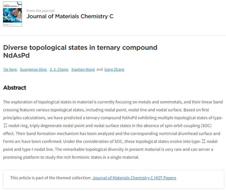 最近,哔咔漫画 青年教师杨铁博士等在材料拓扑元素方向的研究取得重要进展,所形成的阶段性成果Diverse topological states in ternary compound NdAsPd (论文链接://doi.org/10.1039/D0TC02024A) 发表在材料科学Top期刊J. Mater. Chem. C上,并被编辑遴选为热点论文(Hot Paper)。