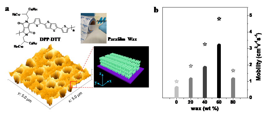 有机场效应晶体管是有机电子学领域的热点方向之一。一般情况下,有机场效应晶体管需要通过热退火处理来提高器件的性能。但是热退火过程不仅使器件的制备工序变复杂,而且还将增加器件的制作成本。雷衍连博士研究团队提出将适量的常用碳氢化合物(如Parafilm® 蜡纸、石蜡等)加入到聚合物半导体(DPP-DTT)的溶液中,通过简单的旋涂制膜方法,在无需热退火处理的情况下,即可得到结晶性较好的沟道层薄膜。这主要是因为碳氢化合物与聚合物半导体之间的相容性较差,因此在二者共混成膜的过程中,碳氢化合物与聚合物半导体之间的快速相分离可以使聚合物半导体快速结晶,且碳氢化合物的分子运动则可以进一步促进聚合物半导体分子的自组装,最终在室温下形成结晶性较好的多孔复合薄膜,其孔壁则由连续的聚合物半导体纳米纤维网构成。将这种方法制备出的多孔复合薄膜用作有机场效应晶体管的沟道层,在室温下获得了最大约 5 cm2 V-1 s-1的空穴迁移率和≥106的电流开关比。这种制备方法简单实用且成本低,有望在印刷电子和有机传感器等方面获得广泛应用。