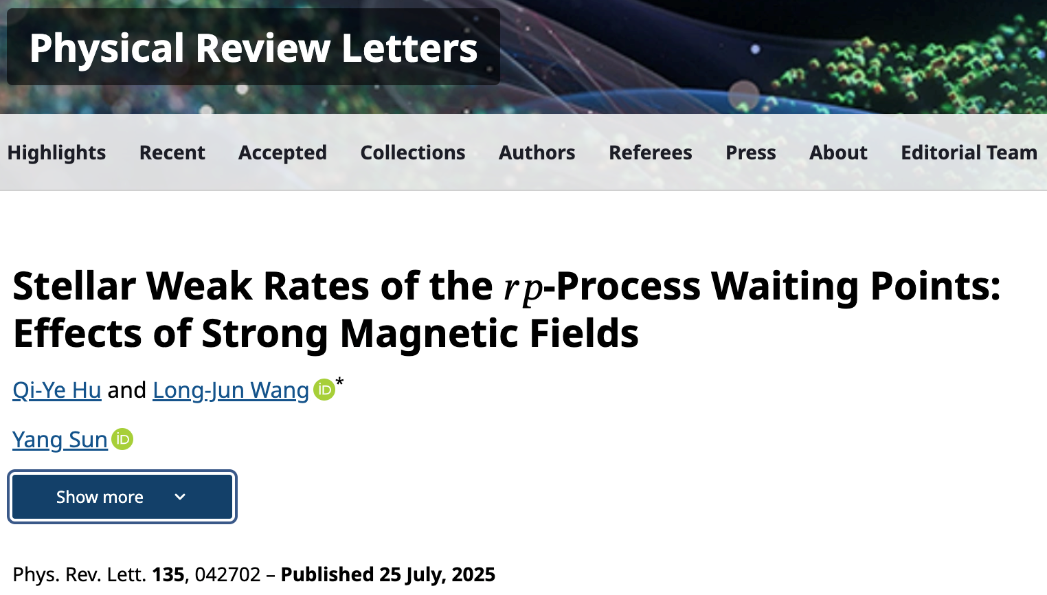 近日,学校哔咔漫画 王龙军教授与上海交通大学孙扬教授合作在物理学顶级期刊Physical Review Letters(简称PRL)上发表题为“Stellar Weak Rates of the rp-Process Waiting Points: Effects of Strong Magnetic Fields”的科研工作。2023级硕士研究生胡其业为第一作者,王龙军教授为通讯作者,哔咔漫画 为第一完成单位。该工作得到了国家自然科学基金(12275225, 12235003)的资助。