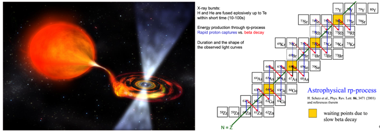 于2003年列为了21世纪11个重大科学问题之一。快质子俘获(rp)过程为重要的天体核合成方式之一,其发生场所被认为是在绚丽的吸积中子星(图二左图)外层,合成路径表现为较轻的原子核连续俘获天体环境下的质子然后再进行衰变与电子俘获过程(图二右图)。其中,64Ge等几个等待点核,由于在地球环境下的