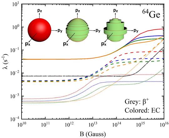 衰变率和电子俘获率极有可能与地球环境下的截然不同。为此,王龙军教授课题组发展了可以同时包含容许跃迁与一级禁戒跃迁以成功计算高温、高密、强磁场的天体环境下原子核弱衰变率与中微子发射率的角动量投影理论与模型,研究结果如图三所示。当磁场较弱时,电子费米球内的朗道能级非常密,面密度与有效朗道能级数的平衡导致衰变率不随磁场的变化而改变。当磁场很强时,朗道能级数目极少,电子俘获率将快速随磁场的增强而增加。这将导致在强磁场环境下rp过程相关核素的总衰变率快速增加,从而影响rp过程的时标、路径、丰度及相应的中微子发射率与冷却过程等。