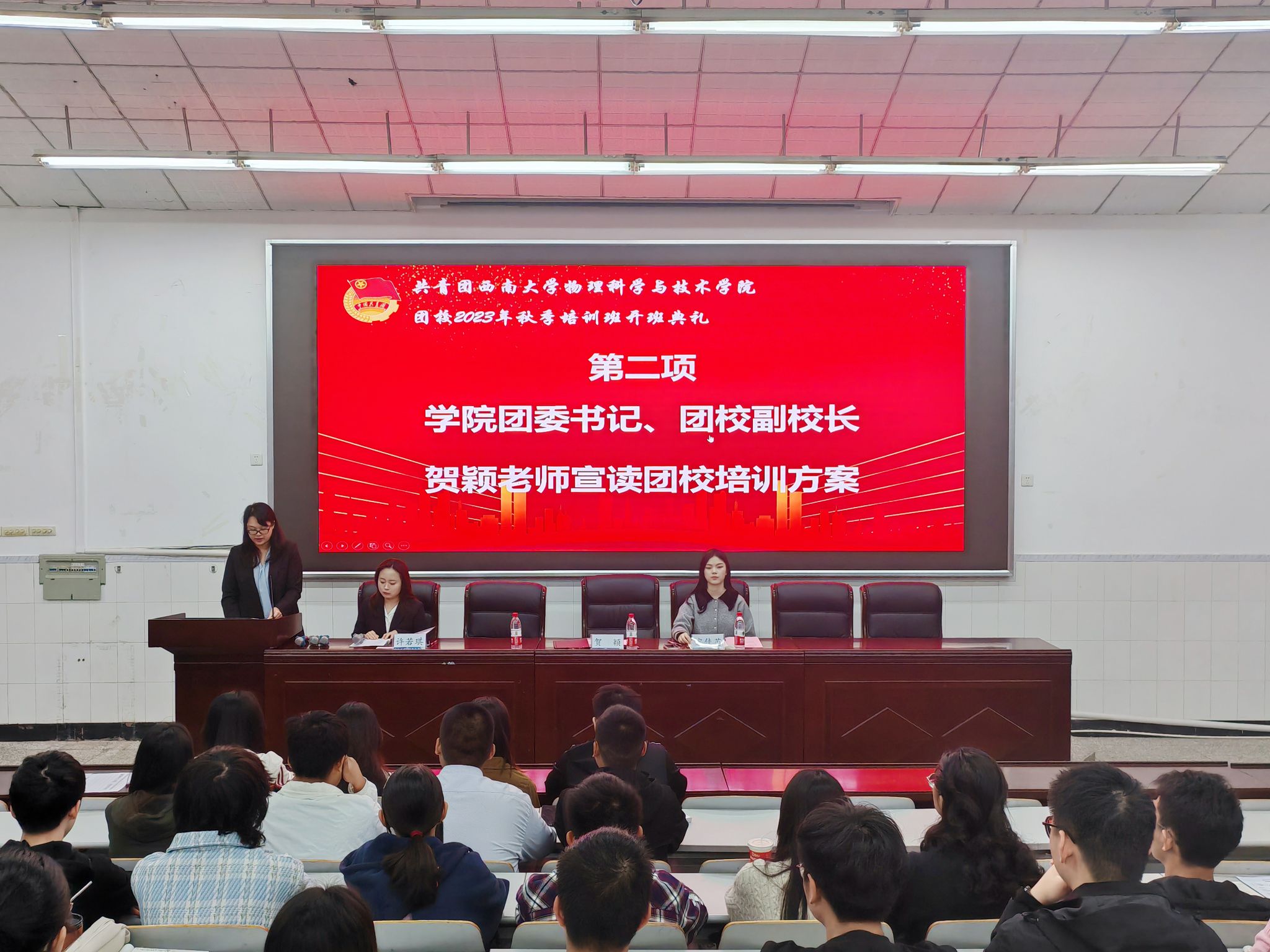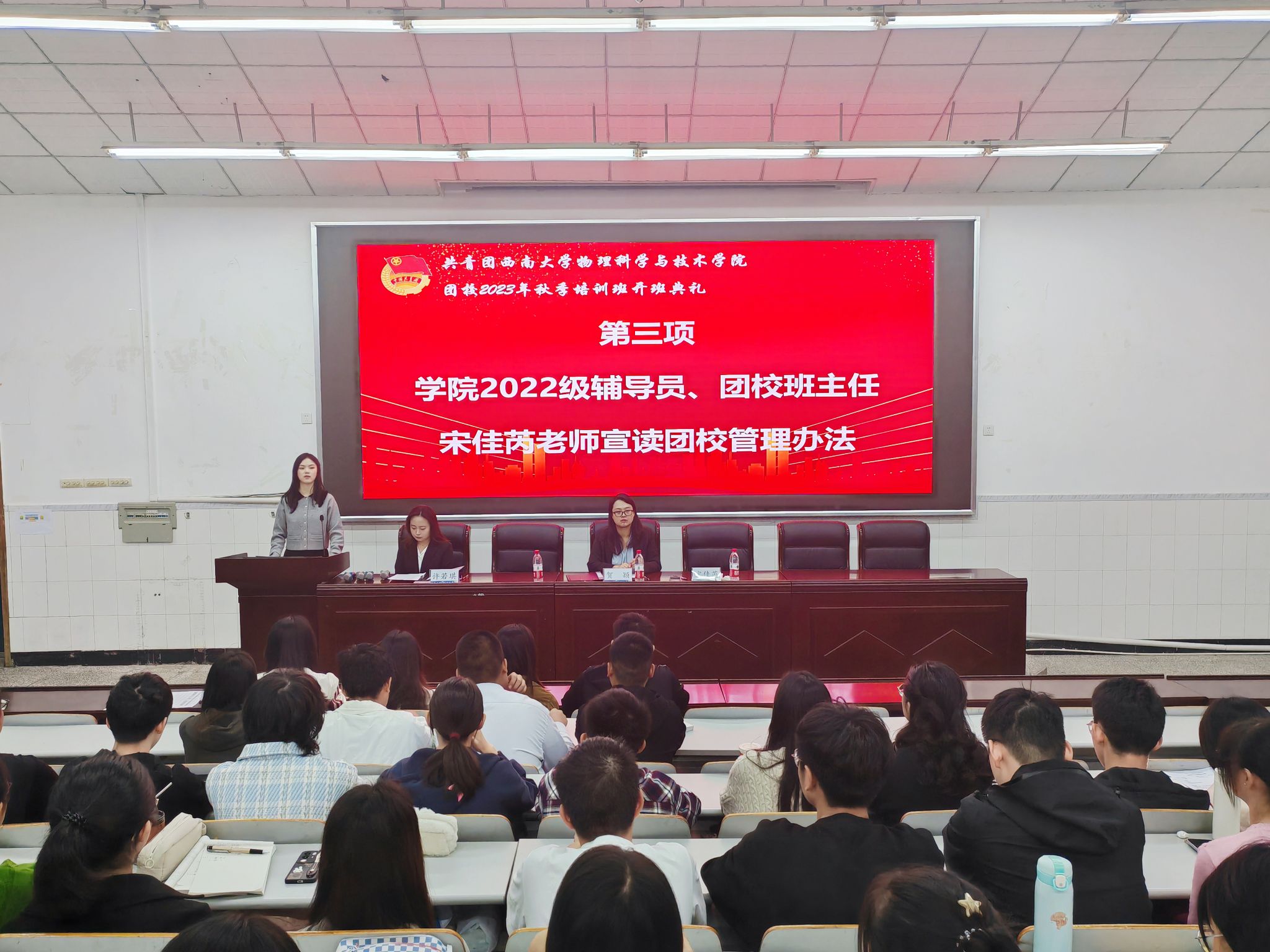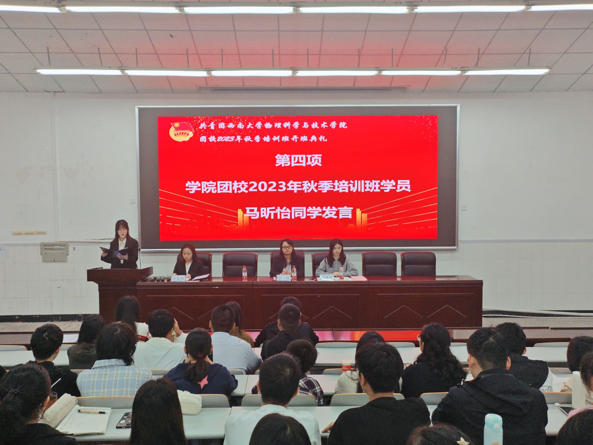 20231022日上午830分,团校开班典礼在物理大楼大阶梯教室举行。哔咔漫画 团委书记、团校副校长贺颖,2022级辅导员、团校培训班班主任宋佳芮和100名参训学员参会。典礼由哔咔漫画 团委副书记、团校培训班班长许若琪主持。