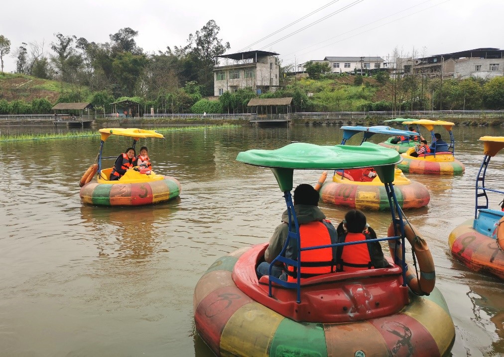 下午时分,老师们三两结队,或适坐品茗、或果园采摘、或池塘垂钓……小孩子们则对碰碰船、滑草情有独钟,互相追逐嬉戏。