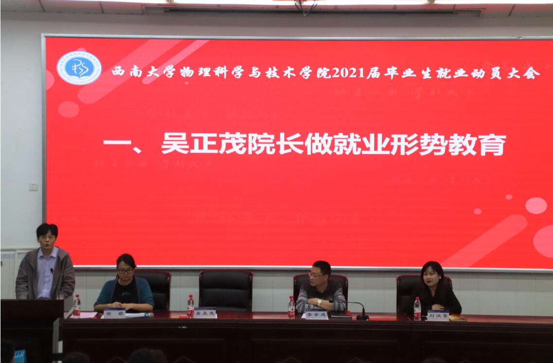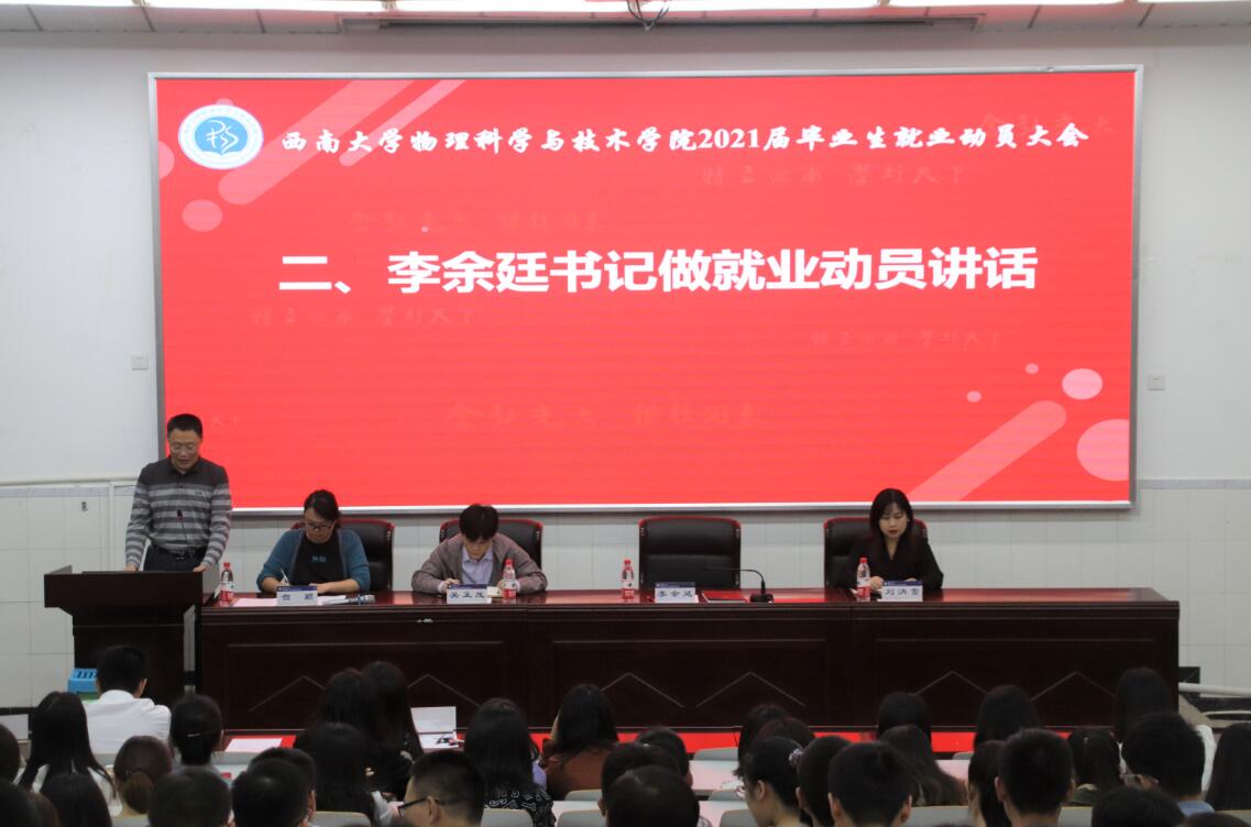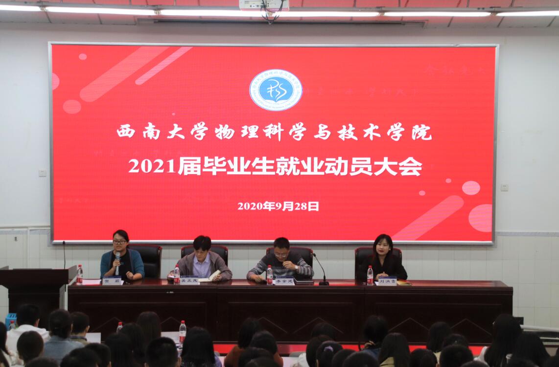 9月28日下午,哔咔漫画 在物理大楼大阶梯教室举办了2021届毕业生就业动员大会。哔咔漫画 党委书记李余廷、院长吴正茂、党委副书记刘汭雪,2017级研究生辅导员熊中碧、本科生2017级班主任杨铁、匡泯泉及2021届全体硕士、本科毕业生参加了会议。动员会由哔咔漫画 团委书记、2017级本科生辅导员贺颖主持。