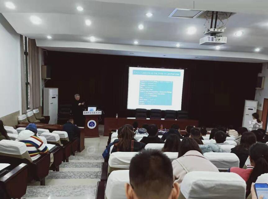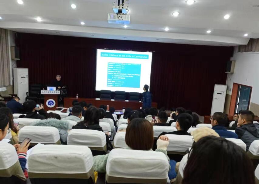 报告会由李志攀教授主持。在报告中,Costel Petrache教授就偶偶核中手征对称性,奇核中三个角动量的相互正交耦合,世界一流的实验仪器等领域展开论述,带领同学们一步一步了解原子核的奇特转动。