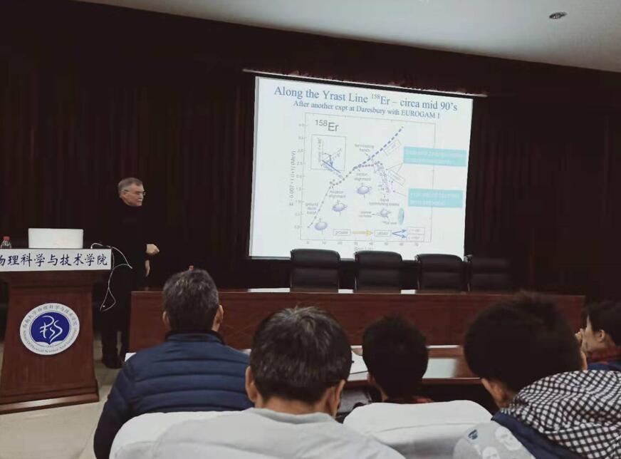 紧接着,Costel Petrache教授分别就偶核中手征对称性,奇核中三个角动量的相互正交耦合等相关知识点展开了论述,深奥的物理知识在他口中变得浅显易懂,适时配合着有趣的肢体语言,使会场师生不自觉地会心一笑。