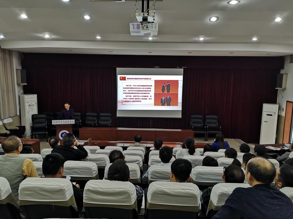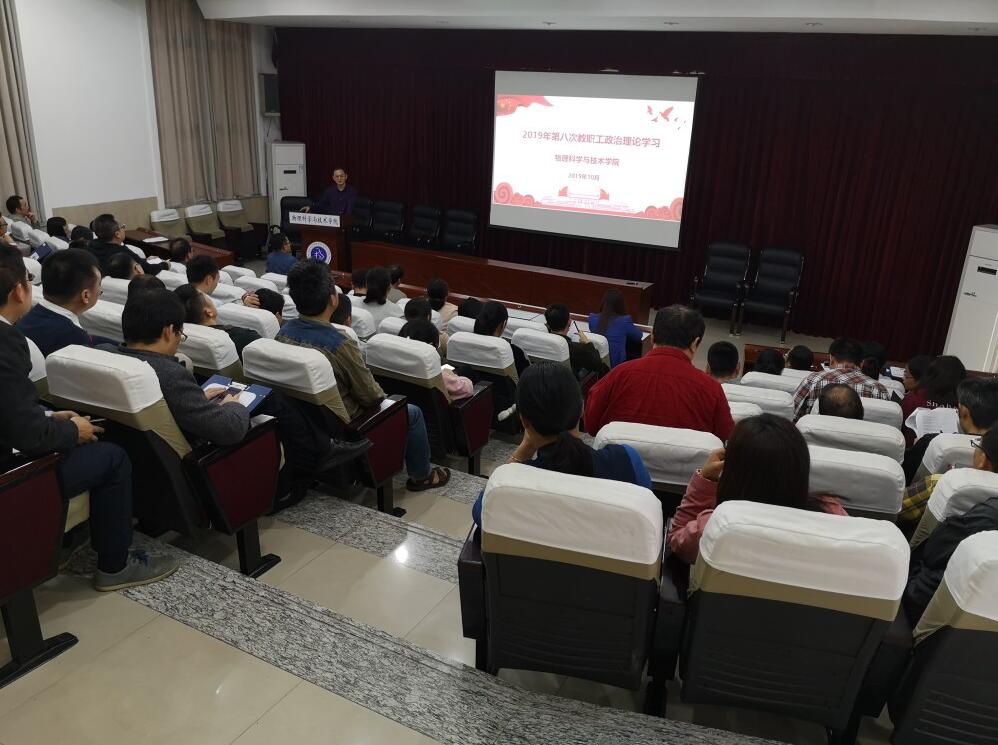 根据学校党委要求和哔咔漫画 “不忘初心、牢记使命”主题教育安排,10月11日下午,哔咔漫画 组织全体在校教职工在小阶梯教室开展2019年第八次政治理论学习,集中学习习近平总书记近期系列重要讲话精神。学习会由哔咔漫画 党委书记李建光主持。