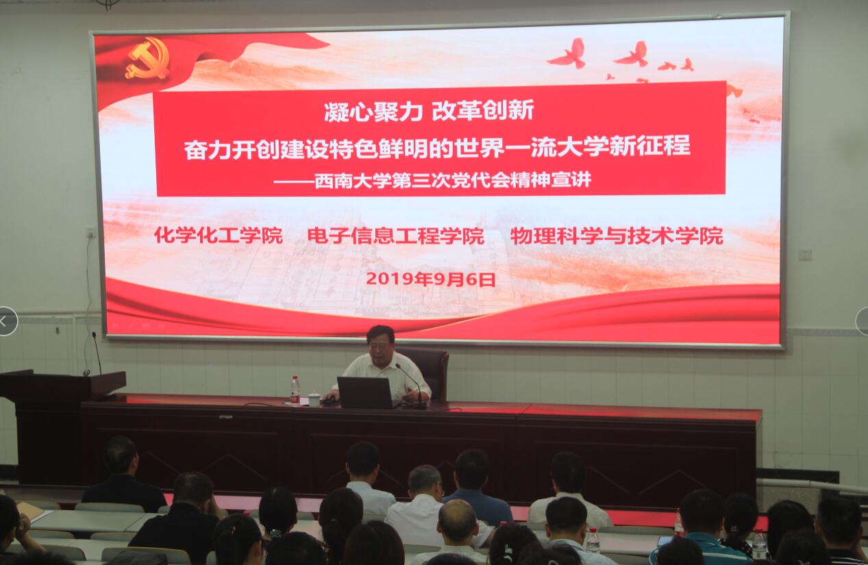 今年7月10-12日,哔咔漫画 第三次党代会胜利召开。9月6日下午,根据学校党委关于学习宣传贯彻第三次党代会精神的统一部署,学校宣讲团成员、党委常委、副校长崔延强教授来到哔咔漫画 ,就全面学习宣传贯彻学校第三次党代会精神作专题宣讲。来自化学化工哔咔漫画 、电子信息工程哔咔漫画 和哔咔漫画 200余名教职工参加了宣讲报告会。报告会由哔咔漫画 党委书记李建光主持。
