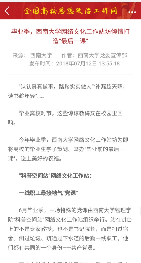 全过程开展劳动教育,强化劳动观念。哔咔漫画 立足特色育人品牌“最后一节思政课”中,多年来都聚焦劳动教育,例如2018年请后勤一线员工讲党员故事,2019年请食堂大厨上“金牌厨师课”。传承半个世纪的“红帽子”志愿服务队,则长期坚持美化西大、维修家电等劳动服务等,全覆盖了每一届物院学子。哔咔漫画 始终将劳动教育贯穿四年校园生活,在劳动文化浸润中促进学生树立劳动意识、增强劳动观念、养成劳动习惯,弘扬勤俭、奋斗、创新、奉献的劳动精神,服务他人和社会,强化社会责任感。