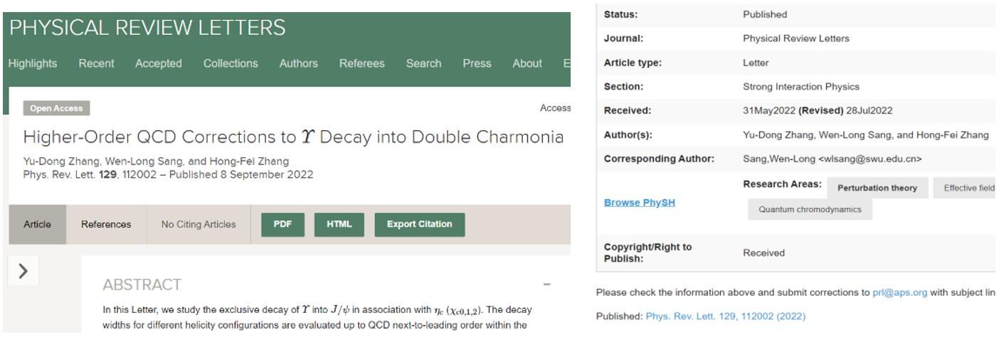 近日哔咔漫画 强子物理团队桑文龙教授与研究生张余栋同学及贵州财经大学的张鸿飞老师在物理学顶级期刊《物理评论快报》(PRL)上发表题为“Higher-order QCD corrections to Upsilon decay into double charmonia”的科研工作,哔咔漫画 为该成果的第一及唯一通讯作者完成单位,其中张余栋同学为第一作者,桑文龙老师为唯一通讯作者。该研究工作得到了国家自然科学基金面上基金资助。