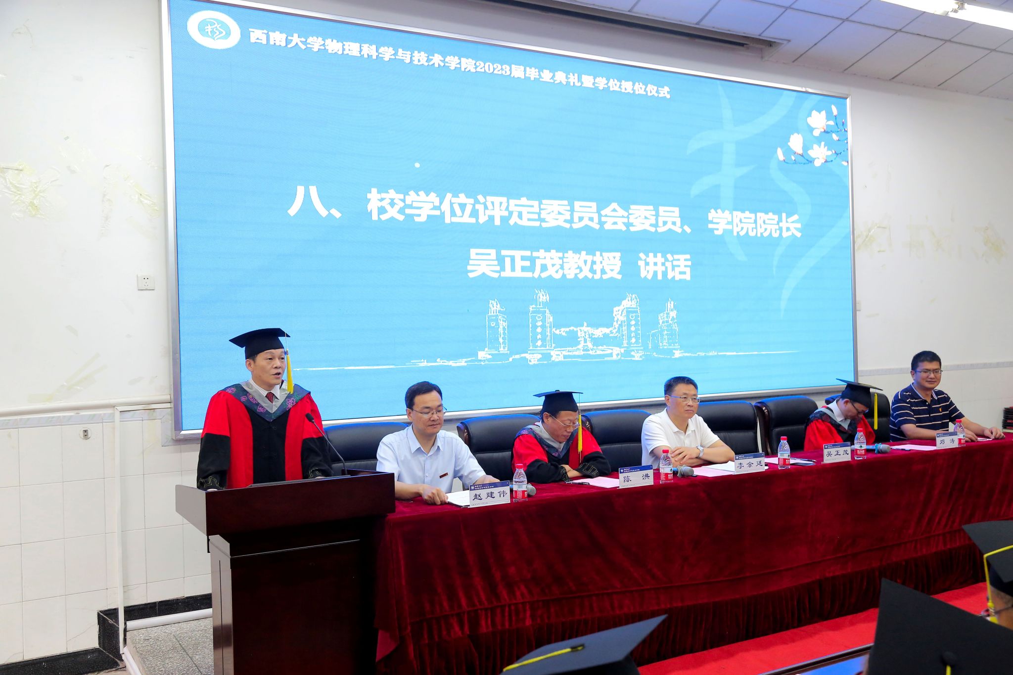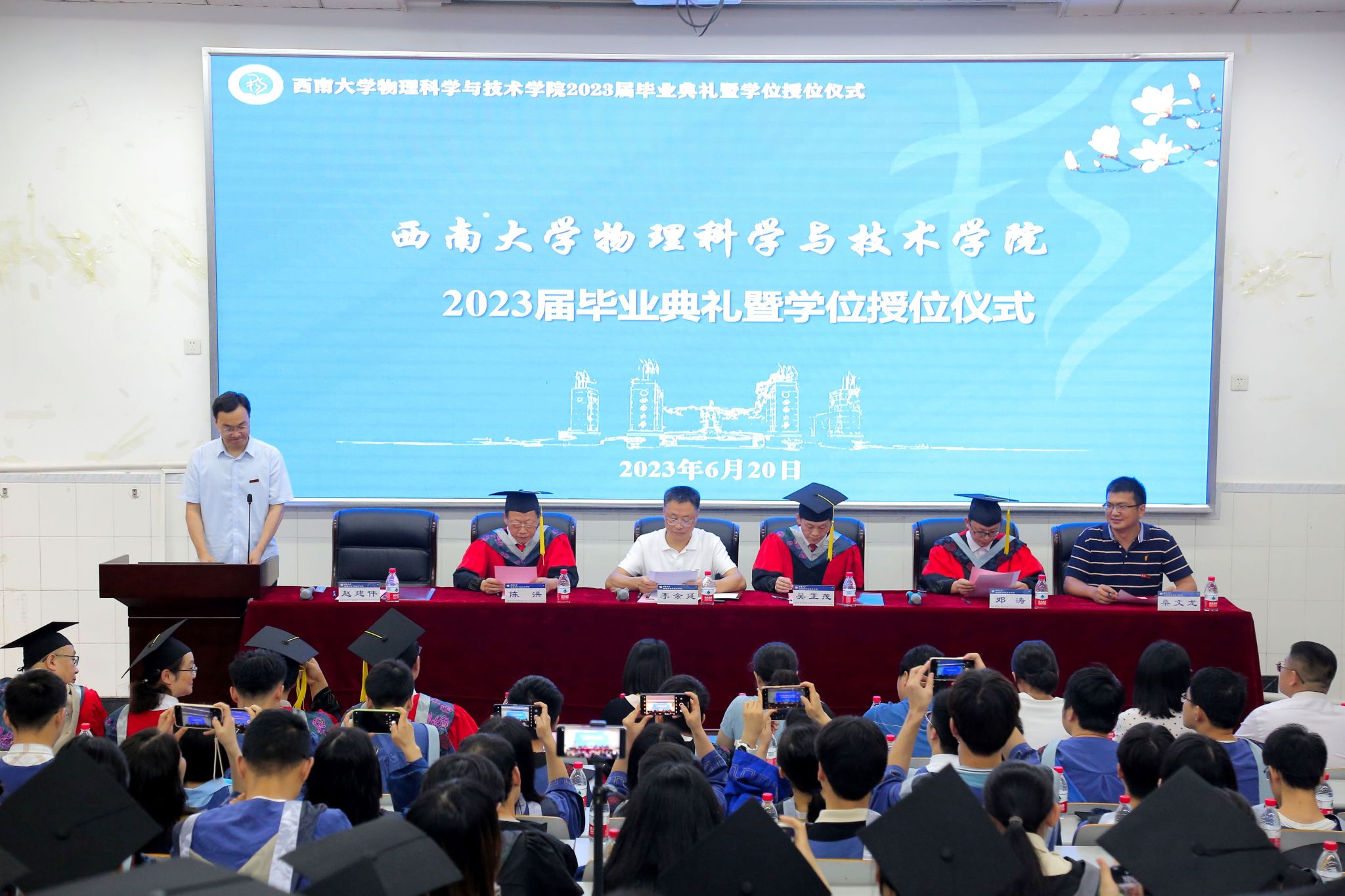6月20日上午,哔咔漫画 2023届学生毕业典礼暨授位仪式在物理大楼大阶梯教室隆重举行。院党委书记李余廷,校学位评定委员会委员、院长吴正茂,院学术委员会主任陈洪,校学术委员会委员、副院长邓涛,副院长桑文龙出席典礼。哔咔漫画 学术委员会全体成员、工会主席、办公室主任、教务办主任、教师代表、毕业年级辅导员和班主任、2023届研究生本科生以及家长代表共计200余人参加了典礼。典礼仪式由副院长赵建伟主持。