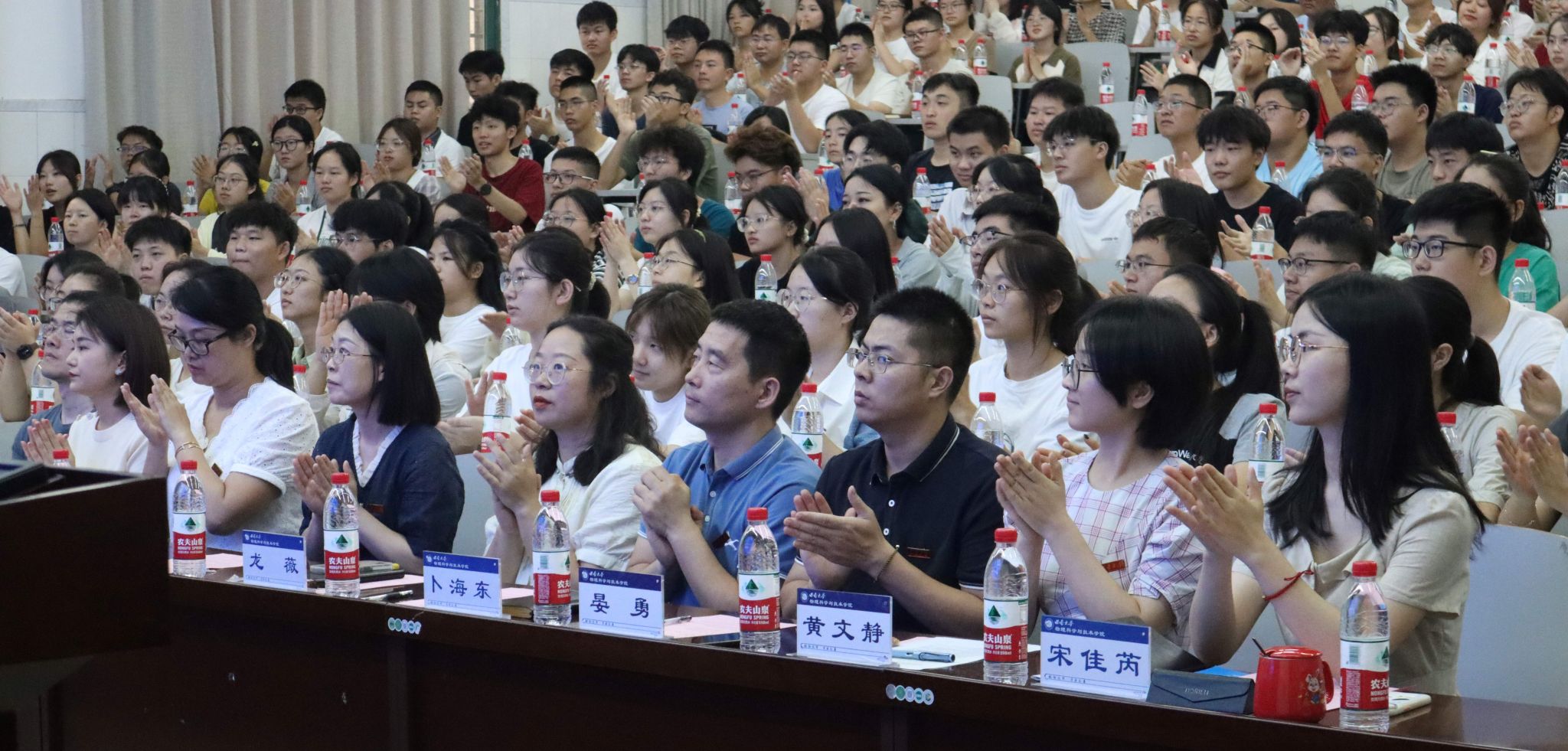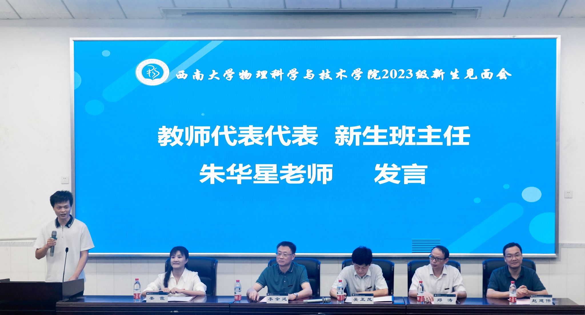 新生班主任朱华星老师作为教师代表发言。他分享了自己在西大物院的求学并留校任教的经历,他说:“来到物院不仅能学习专业知识,还能感受到家庭的温暖和关怀”。同时他也鼓励同学们能细心、用心、耐心、从容地体味大学生活,乘风破浪,勇往直前。
