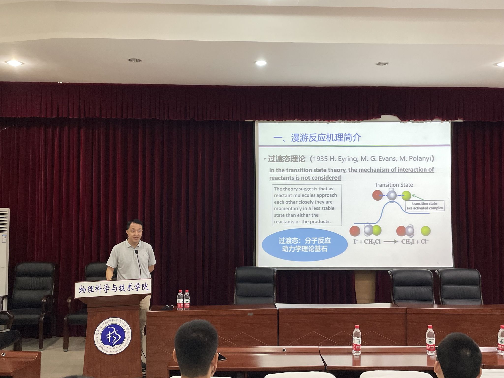 韩永昌教授主要分享了其团队近年来借助全维量子力学或半经典轨线理论计算,揭示了分子反应动力学机理并利用外场对分子量子态实现了精确调控。接着,韩教授对于氢原子与乙炔、乙烯等分子反应碰撞过程中发现的新奇漫游反应机理和超级能量转移现象进行了细致的讲解,提出了多种高效方案用于超快激光脉冲精确控制双原子分子体系光电离、光解离、光缔合和分子空间排布。整个报告内容丰富,脉络清晰,激发了同学们的兴趣,开拓了同学们的视野,引发了同学们的深刻思考。