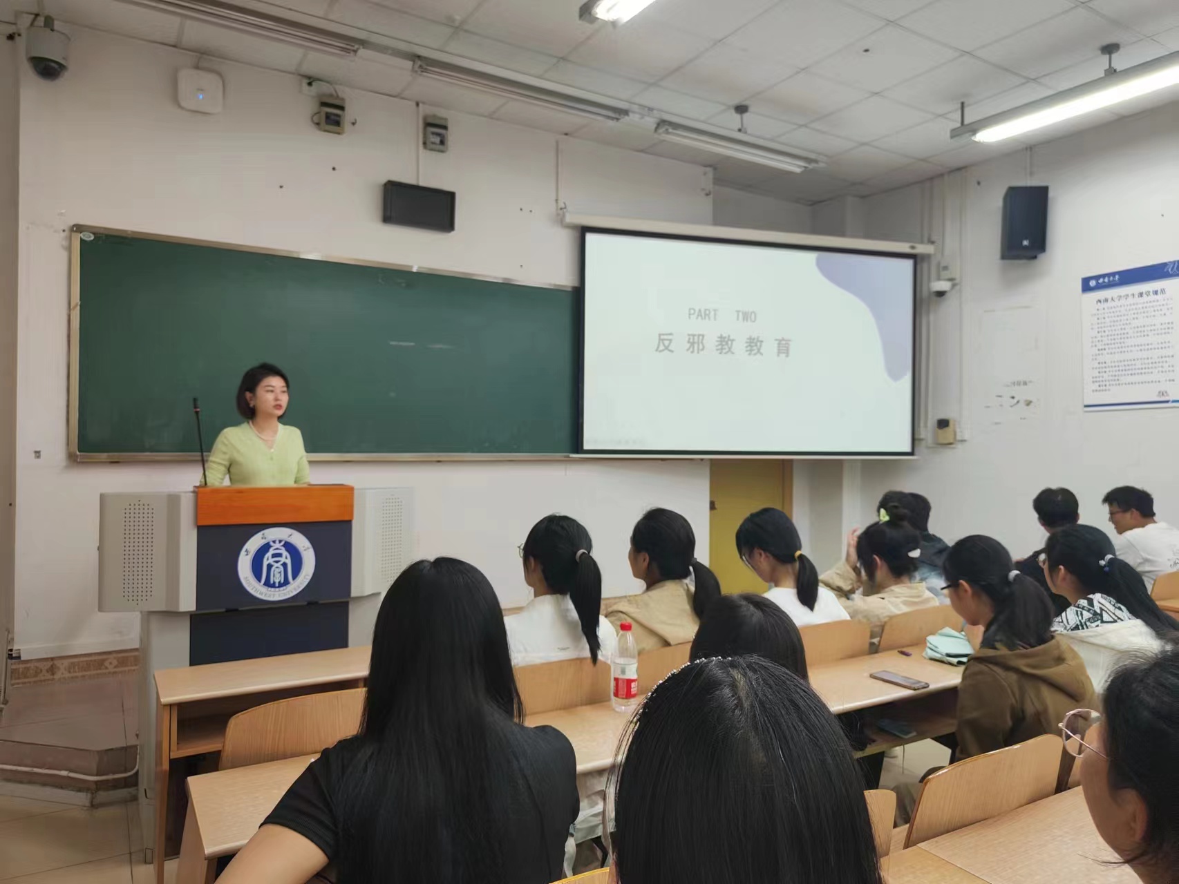 9月27日下午,新生辅导员贺颖老师从人际交往、学业适应、情绪管理等方面进行了心理健康教育专题讲座,全面介绍了心理求助渠道和学校心理健康教育资源。安全辅导员晏勇老师聚焦校园生活安全、实验室安全、财产安全、国家安全和电信诈骗安全,结合案例数据强调了安全无小事。