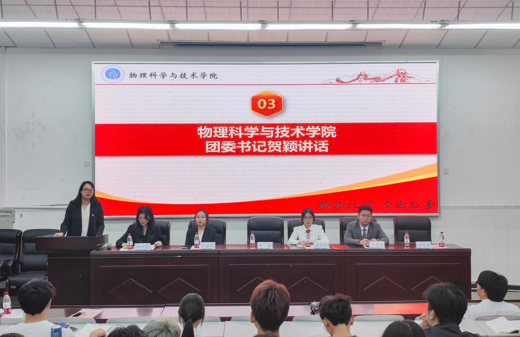 14:40,伴随着慷慨激昂的国歌,第一次全体大会拉开帷幕,会议由学生会构学部田雨竺同学主持。宣传中心主任谢宇梦同学、团委副书记许若琪同学分别宣读了院党委会批复和校学委会批复。