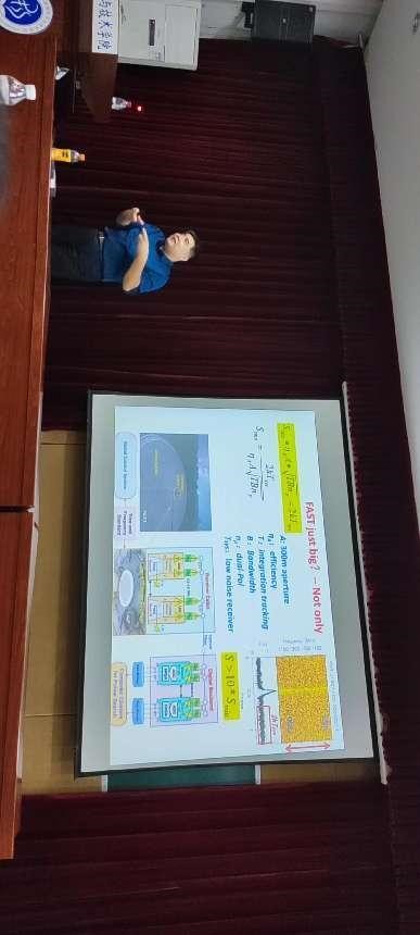韩金林教授首先介绍了脉冲星的基础理论:脉冲星是旋转的中子星,以一个接一个脉冲的方式辐射射电波并穿越星际介质。在过去的55年里,世界各地的射电望远镜已经发现了3000多颗脉冲星。然后介绍了近年来我国建造的国家级项目FAST(五百米口径球面射电望远镜,也称天眼),在过去的5年里,韩金林教授团队用它来对银河系平面进行巡天观测,已经发现了730多颗脉冲星,其中包括170颗在双星系统中的脉冲星。还发现了一些具有强相对论效应的双星系统,以及8个源自银河系外的快速射电爆源。