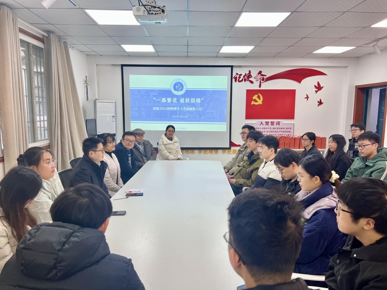 在2025考研冲刺的号角已然响起之际,12月11日上午,来自2021级物理学班的22名考研学生代表受邀来到哔咔漫画 党建活动室活动室参加 “一路繁花,前程似锦”2025届考研学子慰问活动。哔咔漫画 党委书记舒刚、副书记娄霞、副院长游霄鹏,2021级班主任李佳杰、赵晶晶和辅导员黄文静等老师来到现场,为考研学子加油打气,提振信心。