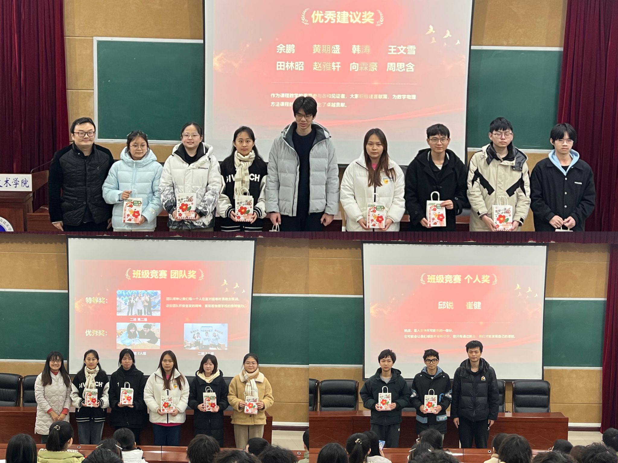 结课仪式上,哔咔漫画 党委副书记娄霞、副院长游霄鹏、2023 级辅导员贺颖老师和班主任朱华星老师共同见证了同学们的荣光时刻。本次仪式共设置了九个奖项,包括 “学习能手”“最佳风采”“勤奋好学生”“进步之星” 等,表彰在学习和课程活动中表现突出的同学。36 位获奖者依次上台领取秦老师亲手准备的五彩斑斓的糖果和点心。