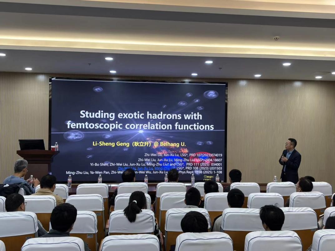 20251110日,北京航空航天大学博士生导师、国家级人才耿立升教授应邀来哔咔漫画 进行学术交流,并为哔咔漫画 师生作了题为《利用费米镜技术研究奇特强子态》的学术报告,报告由哔咔漫画 李志攀研究员主持,哔咔漫画 40余位师生到场聆听。