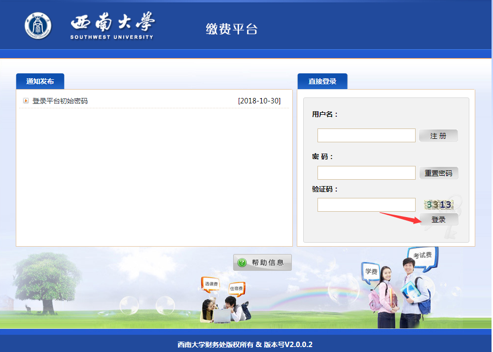第1步:登录网上缴费平台(//upay.manhuapica.net/payment/login.jsp),用户名、初始密码为身份证号,输入验证码后,点击“登录”按钮。