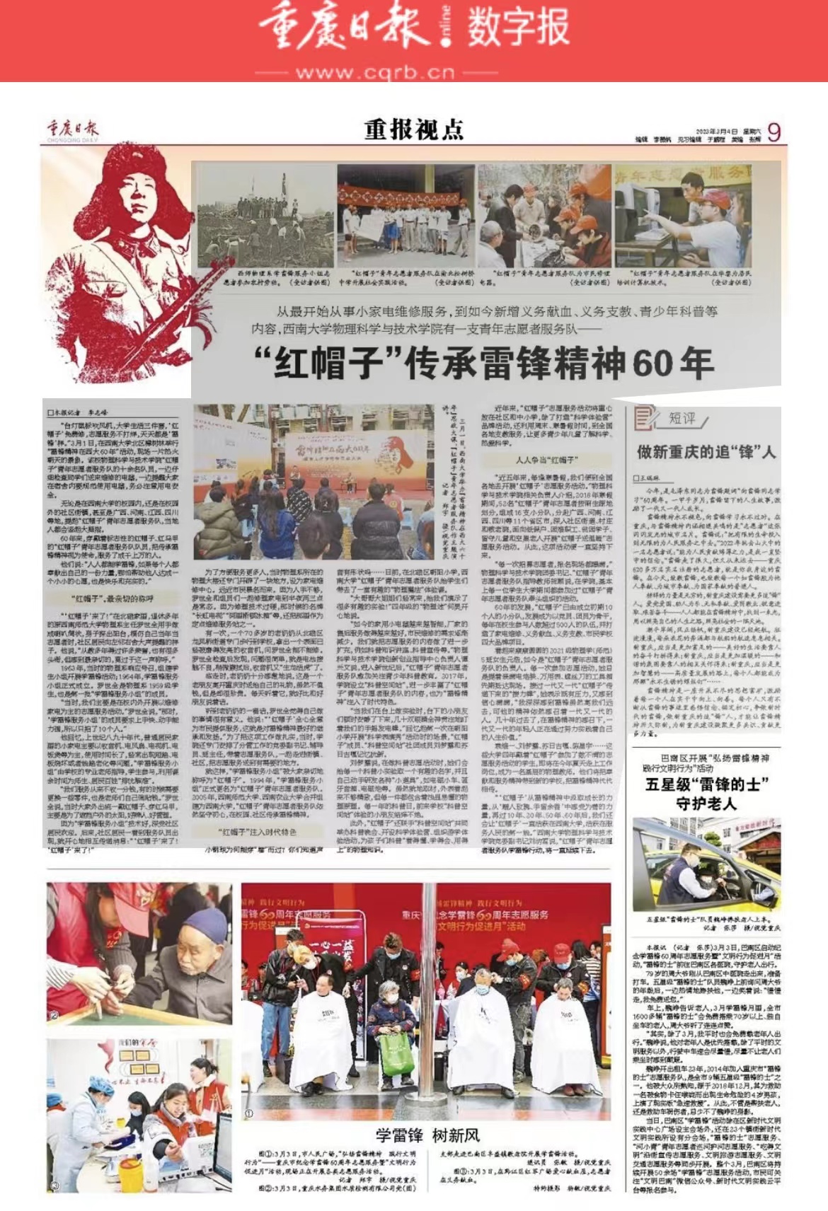 “一团火的热情真诚、一滴水的博爱宽容、一颗钉的勤奋钻研、一块砖的朴实坚韧、一片叶的感恩奉献”,60年来哔咔漫画 “红帽子”志愿者服务团队用一个个具体行动学习践行雷锋精神,书写了一个个鲜活的学雷锋故事,获得了重庆日报长篇专题报道宣传——《“红帽子”传承雷锋精神60年》,以下为全文报道。