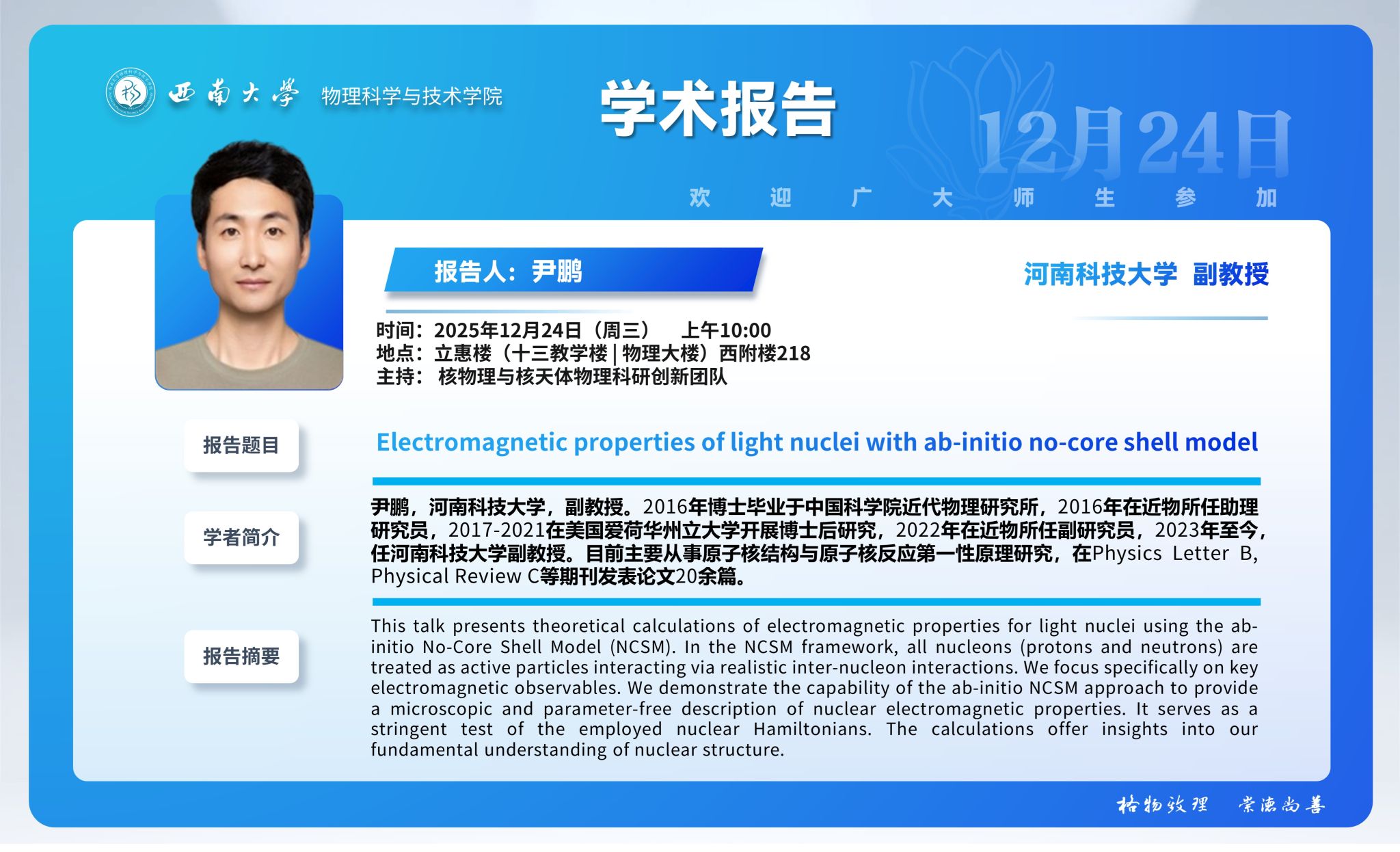 【学术报告】Electromagnetic properties of light nuclei with ab-initio no-core shell model
