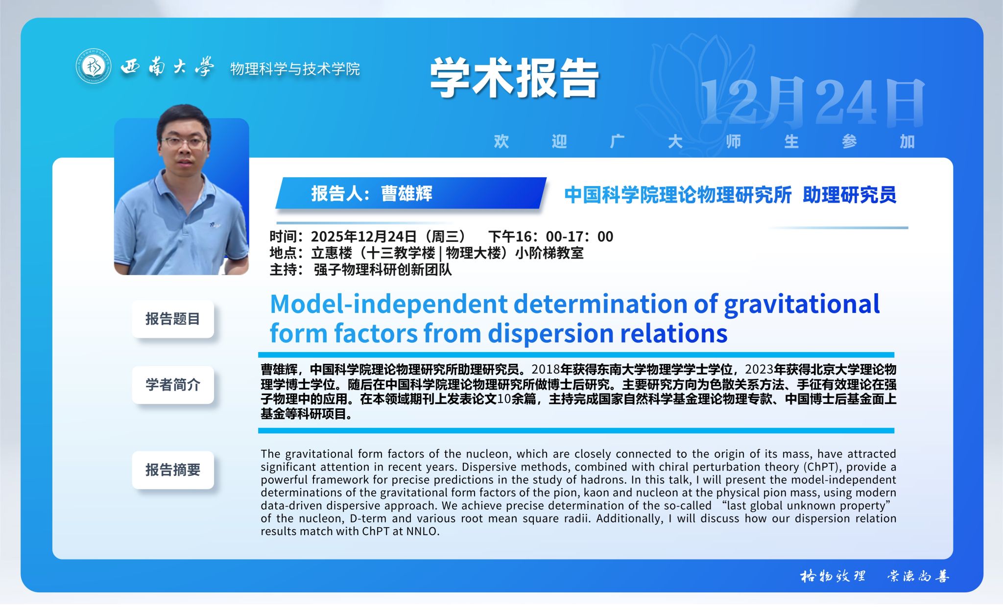 【学术报告】Model-independent determination of gravitational form factors from dispersion relations