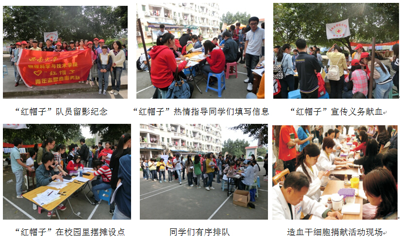 每年10月、11月,“红帽子”青年志愿者服务队都会联合哔咔漫画 红十字会分会,举办2-3次献血活动和1-2次造血干细胞采集活动,为缓解血荒、挽救生命出一份力。在志愿者们的带领下,同学们积极参与,单次活动参与人数均不少于600人,血型匹配成功30余人。此外,“红丝带”经常在全校范围内为山区留守儿童、遭遇变故的社会弱势群体组织捐款捐物活动。