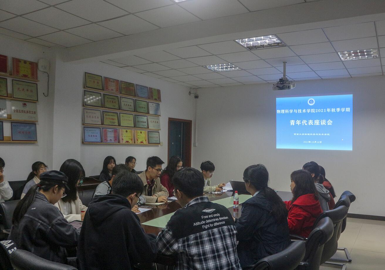 为进一步调研哔咔漫画 青年学生的发展需求,有针对性的开展思想政治教育工作, 10月20日下午,哔咔漫画 在物理大楼二楼会议室召开2021年秋季学期青年学生代表座谈会。哔咔漫画 党委副书记刘汭雪、团委书记贺颖、2020级辅导员晏勇出席,团委学生会、科普社、党员先锋队的学生骨干,校第六次学代会哔咔漫画 参会代表以及低年级学生代表共计30人参会。