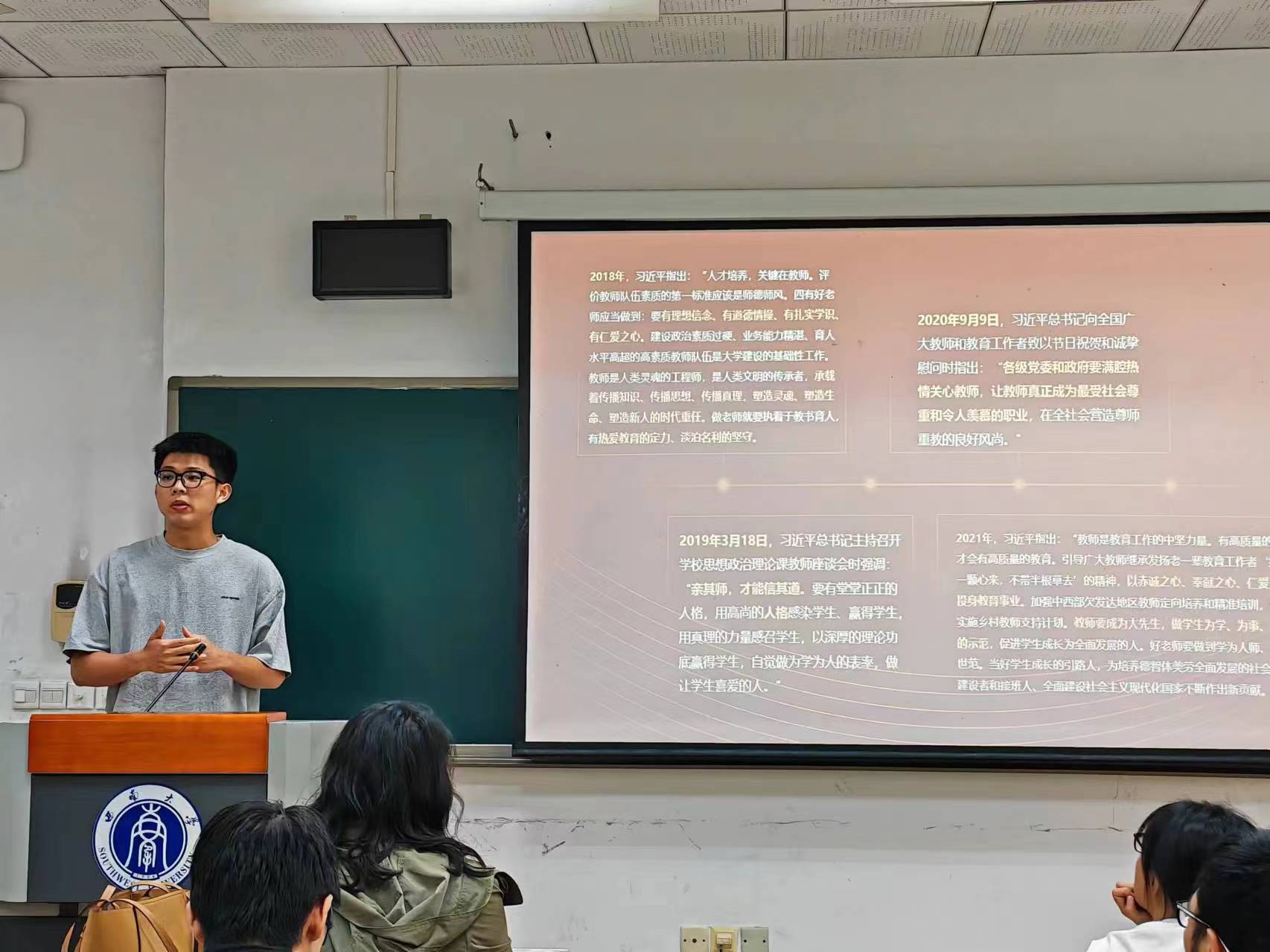 首先,为了让团员青年充分了解新时代教师的使命和担当,本科生第三党支部党员2020级陈桢恺同学带领大家集中学习了习近平总书记关于教师队伍建设的重要指示精神。从教师是“立教之本、兴教之源”到教师应“以德施教,以德立身”;从教师承担“塑造灵魂,塑造生命,塑造人”的责任到教师应“有理想信念、有道德情操、有扎实学识、有仁爱之心”这些内容是教师队伍建设的努力方向,也是国家对教师教书育人工作的明确要求。