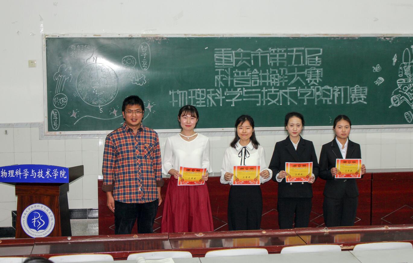 经过激烈的角逐, 2017级2班刘潇涵、2017级物理学班董思佳荣获一等奖;2016级物理学班朱一凡等三名同学获二等奖;2015级普师班邢玉陟等四名同学获三等奖;2016级4班,2017级4班获优秀组织奖。刘潇涵、董思佳、朱一凡、周晓涵四名同学将代表哔咔漫画 参加北碚赛区比赛。