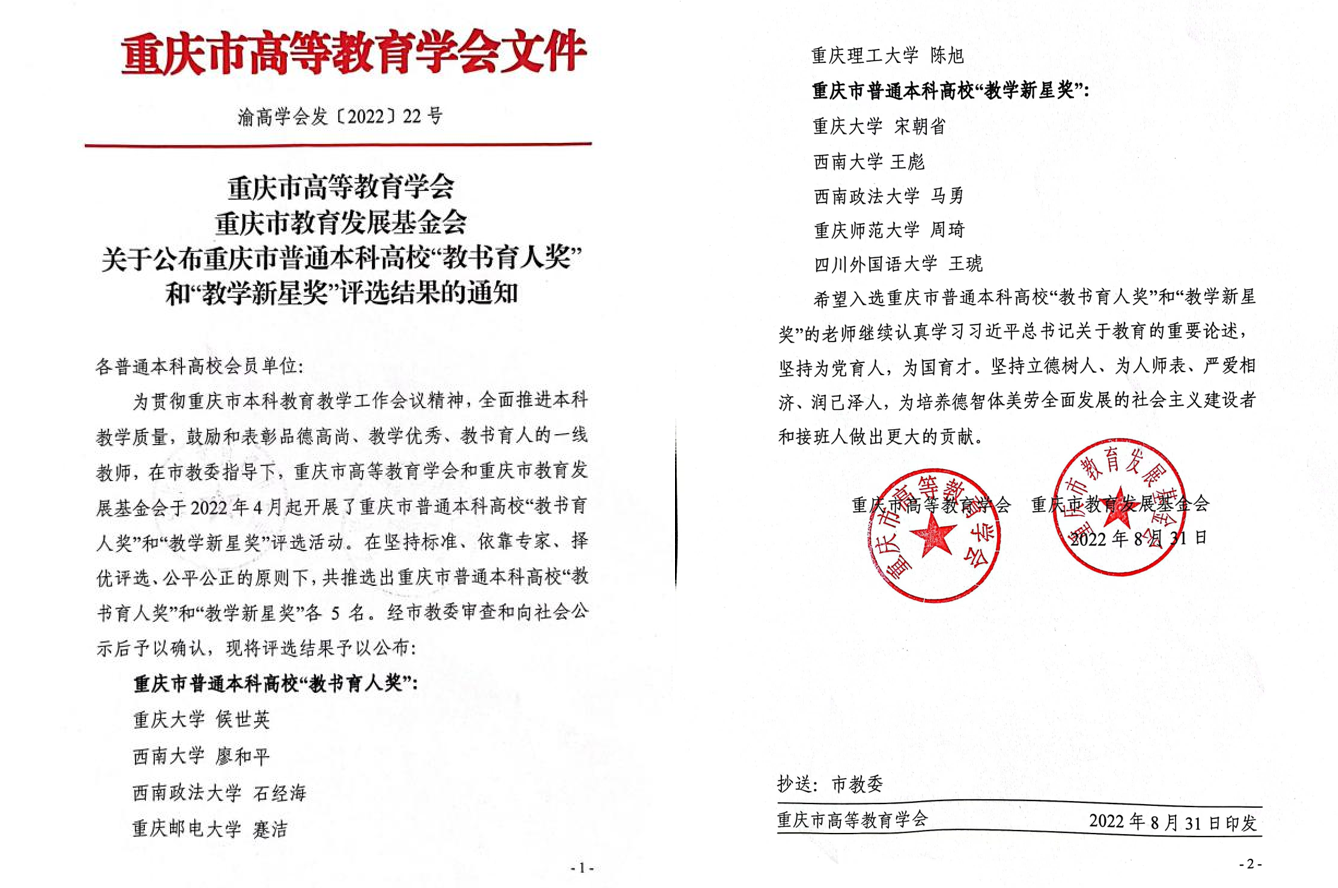 近日,为贯彻重庆市本科教育教学工作会议精神,全面推进本科教学质量,鼓励和表彰品德高尚、教学优秀、教书育人的一线教师,在市教委指导下,重庆市高等教育学会和重庆市教育发展基金会在全市共推选出重庆市普通本科高校“教书育人奖”和“教学新星奖”各5名。哔咔漫画 王彪老师喜获重庆市普通本科高校“教学新星奖”。